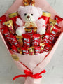 Brighten someone’s day with the Teddy and Chocolate Gift Bouquet. This adorable bouquet features a soft pink teddy bear surrounded by Twix, KitKat, and Ferrero Rocher chocolates, all wrapped in a charming pink wrap and tied with a red ribbon. A perfect gift for spreading joy and love.