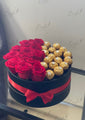 A timeless expression of love, this round signature box features a flawless blend of velvety red roses and Ferrero Rocher chocolates. Tied with a sleek red satin ribbon, it brings together romance and indulgence in the most elegant way. The half-and-half design is perfect for those who adore both floral charm and sweet delights. Ideal for anniversaries, proposals, or romantic surprises, this luxurious gift speaks volumes without saying a word.