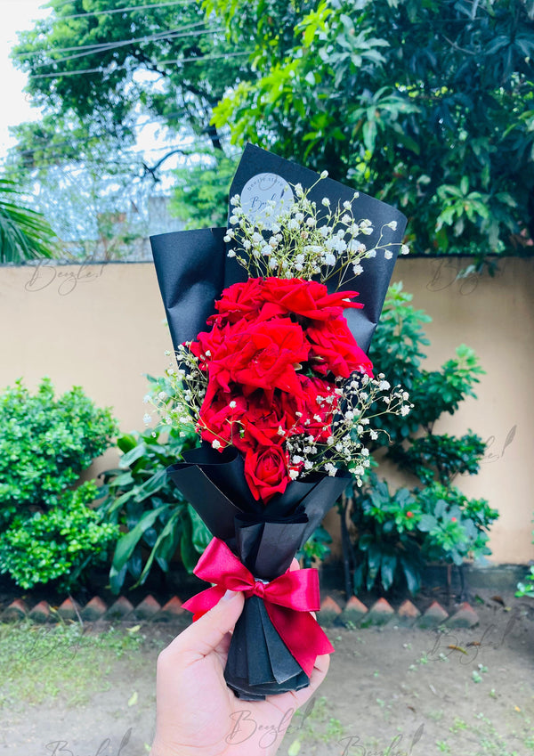 Send love with a mini red rose bouquet – bold, elegant, and effortlessly charming. This red rose bouquet is wrapped in elegant black paper, highlighted with baby’s breath, and tied with a deep red satin bow. Perfect for quick gestures of love, apologies, or sweet surprises, this bouquet speaks bold affection in a delicate form. A chic and compact choice for heartfelt gifting.