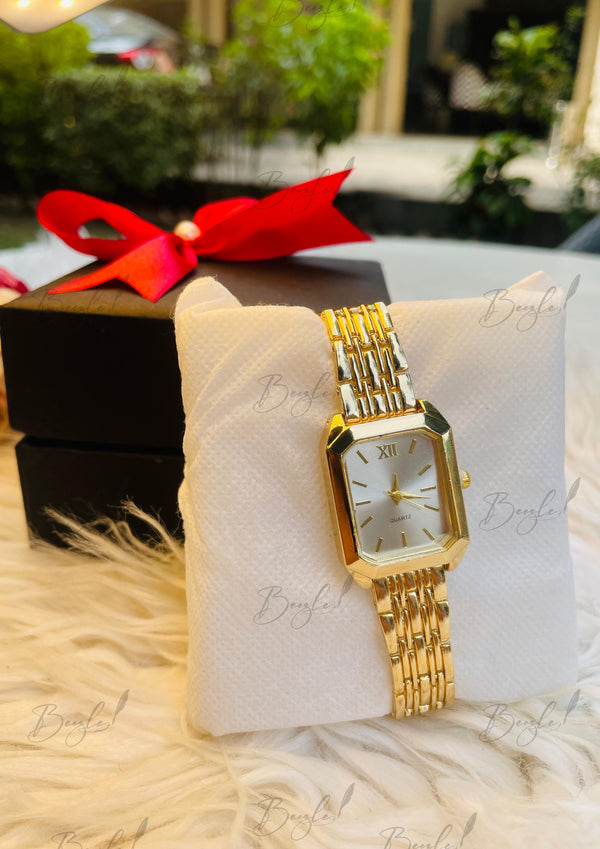 Add charm and grace to her wrist with this sleek gold wristwatch, designed with a rectangular dial and a linked metallic strap for a refined look. The minimalist face and elegant gold finish make it a perfect pick for both daily wear and special occasions. Delivered on a soft pillow inside a premium black box with red ribbon, it's a complete gift that's both practical and beautiful.